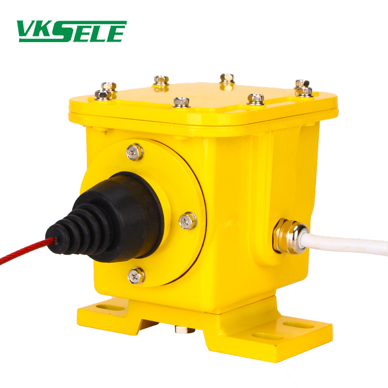 The rip switches are mounted in pairs on both sides of the conveyor belt. They are connected by two sections of wire rope. One end of the wire rope is fixed to the support bracket and the other end is attached to the pull ring of the rip switch. The two sections of wire rope form a monitoring surface under the conveyor belt. When an object or torn belt is suspended down and swept down to the wire rope, the wire rope pulls the tear switch pull ring to make it move and the tear switch sends out an alarm or stop signal. When an emergency occurs on the belt transport site, pull the aviation wire rope tied to the lifting lug to make the slider in the machine with the switch, and issue the stop signal. After loosening the wire rope, the switch automatically reset.