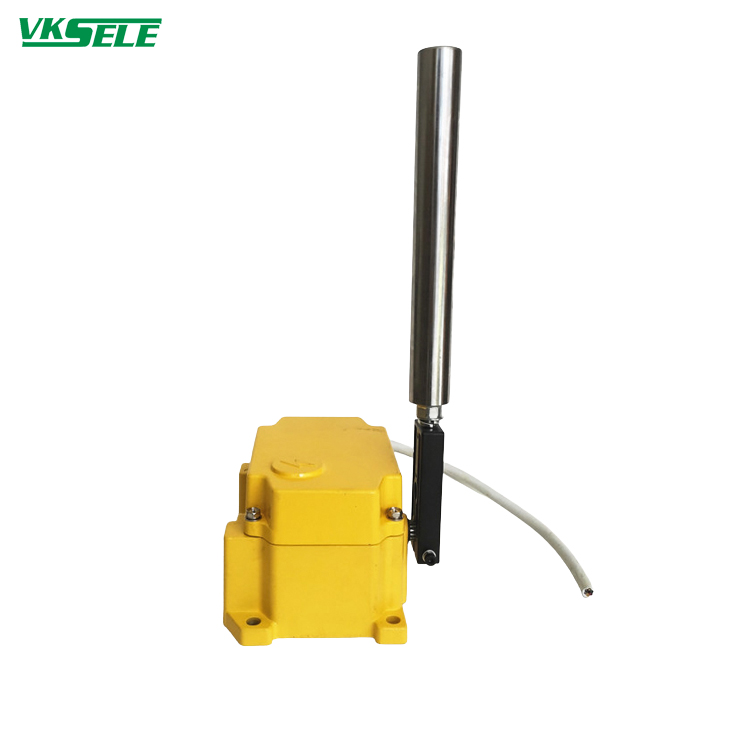 The anti-deflection switch can be fixed at the top or bottom of the longitudinal beam of the conveyor, and the action rod is about 25mm from the edge of the tape, usually installed on both sides of the tape at a distance of 0.3-2 m from the head or the tail. When the running tape is deflected, the edge of the tape drives the stick to rotate and squeeze to make it tilt, if the stick tilts more than the first action angle, the switch issues a set of switch signals, if the stick continues to tilt more than the second action angle, another set of switch signals is output. The two sets of switch signals can be used for alarm or stop respectively. After the tape machine has been reset to normal operation, the stick will be automatically reset.